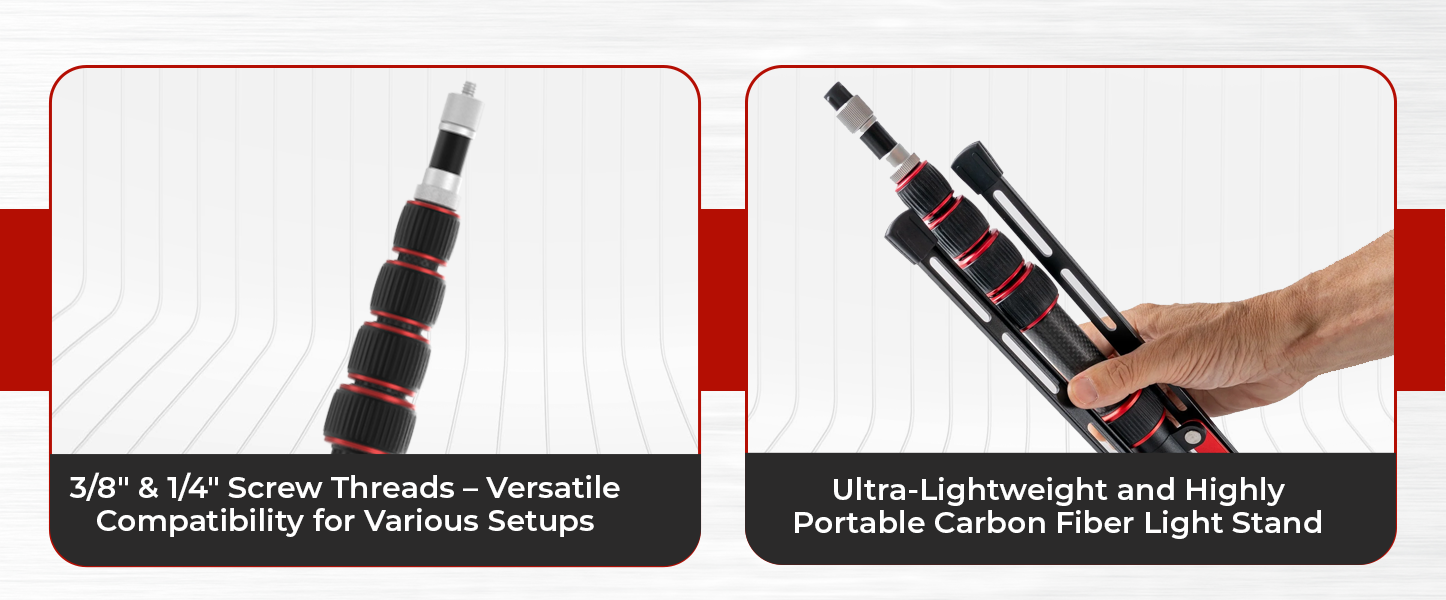 Equipped with a 1/4" to 3/8" screw adapter, the stand works seamlessly with a wide range of gear — from cameras and flashguns to softboxes and continuous lighting. Its robust carbon fiber frame delivers rock-solid stability, even for heavier equipment.